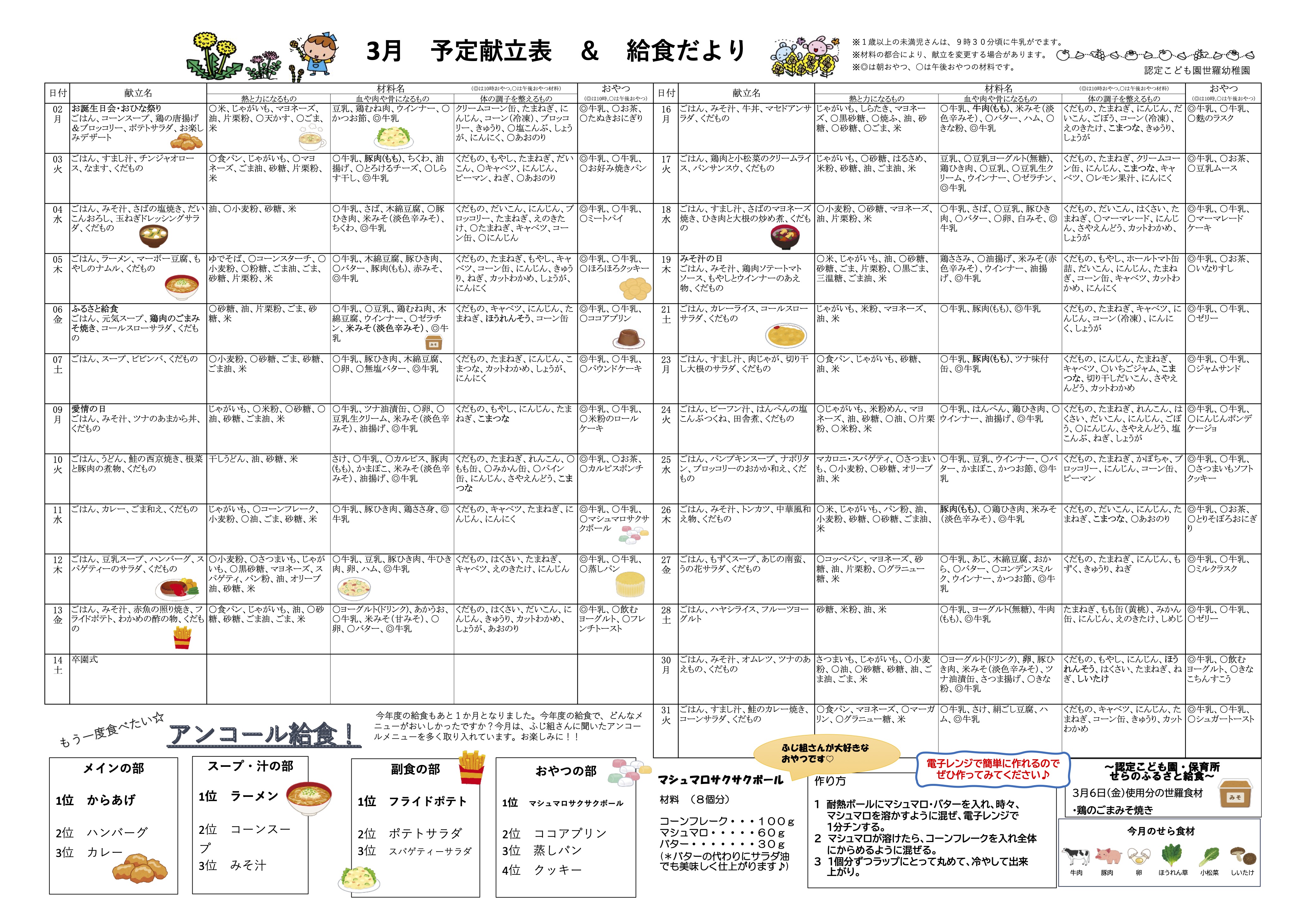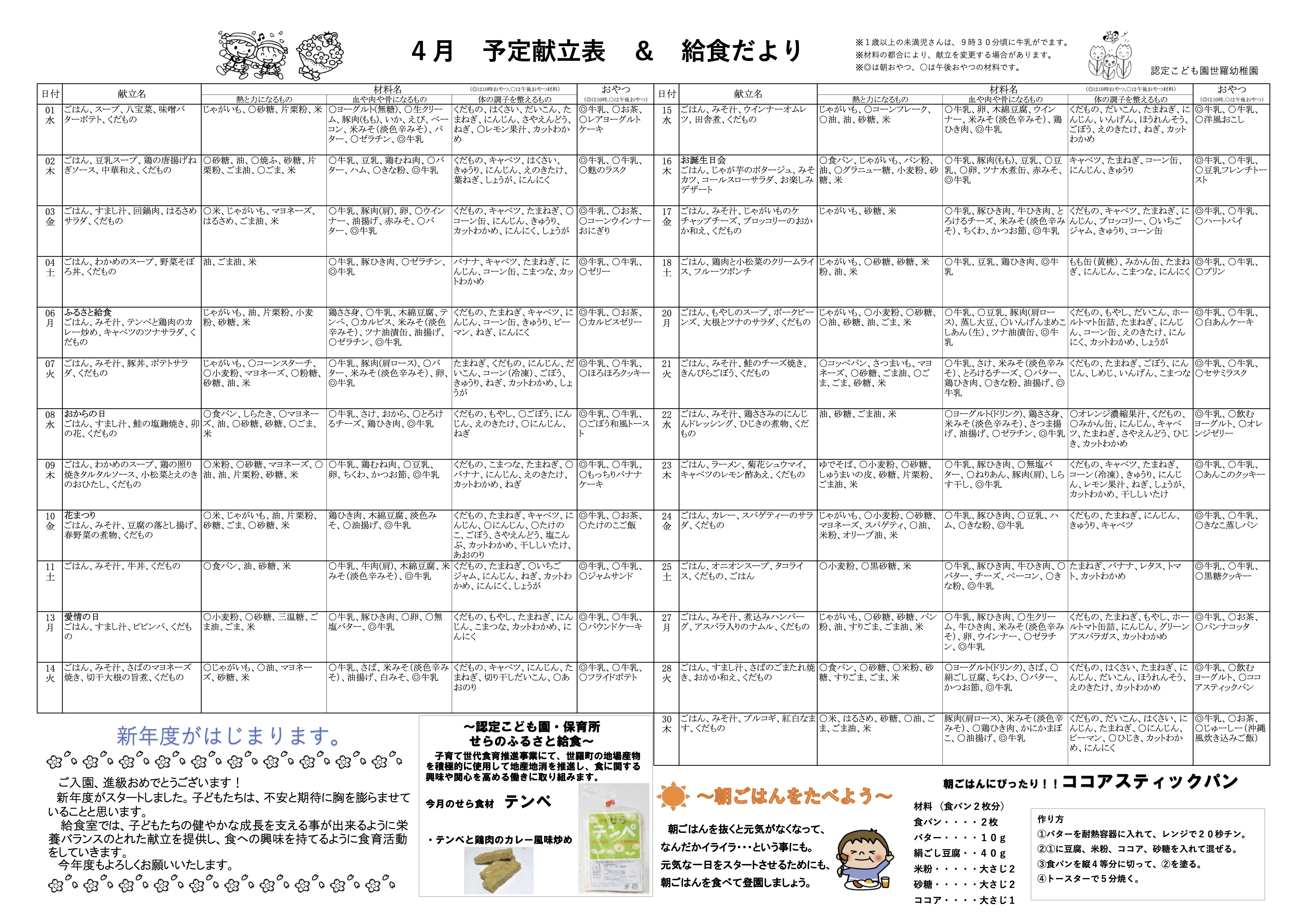「給食だより」 2026.4月号 ※クリックすると、拡大します。 [給食だより 2026.4月号 印刷用PDFファイルのダウンロード] 2026.3月号 ※クリックすると、拡大します。 [給食だより 2026.3月号 印刷用PDFファイルのダウンロード] 食育活動 2026年3月14日【園の様子】3月14日「卒園式」2026年3月2日【園の様子】3月2日「お誕生会」2026年2月27日【食育活動】2月27日「野菜総集編」2026年2月20日【食育活動】2月20日「ブロッコリーとカリフラワー」2026年1月19日【食育活動】1月19日「粉の話」2026年1月7日【食育活動】1月7日「七草」2025年12月19日【食育活動】12月19日「れんこん」2025年12月10日【食育活動】12月10日「味覚ってなに?」2025年11月24日【食育活動】11月24日「和食の日」2025年11月14日【食育活動】11月14日「いろんなイモ」